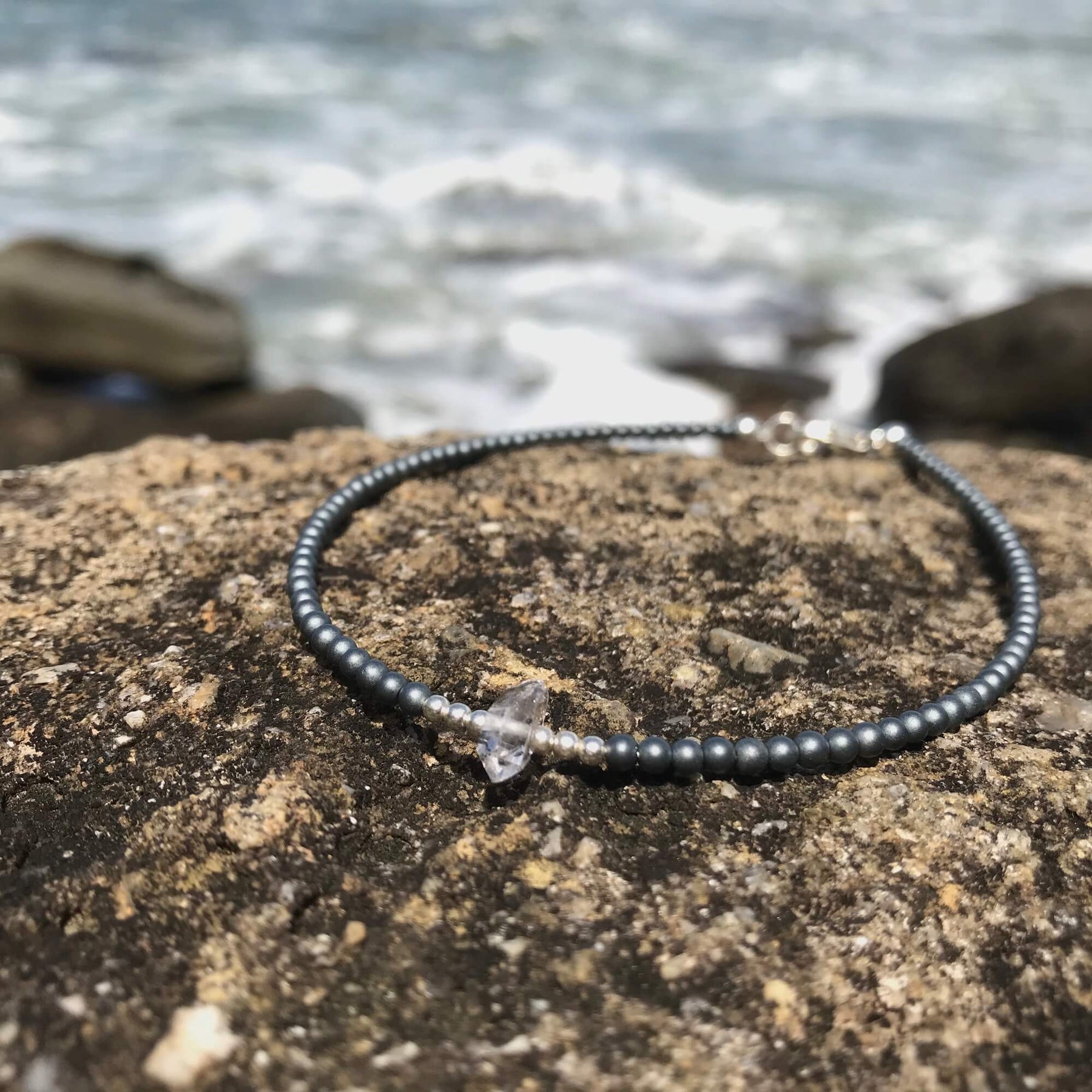 The Seeker of Light Anklet features a Herkimer Diamond, a powerful amplifier of spiritual energy.