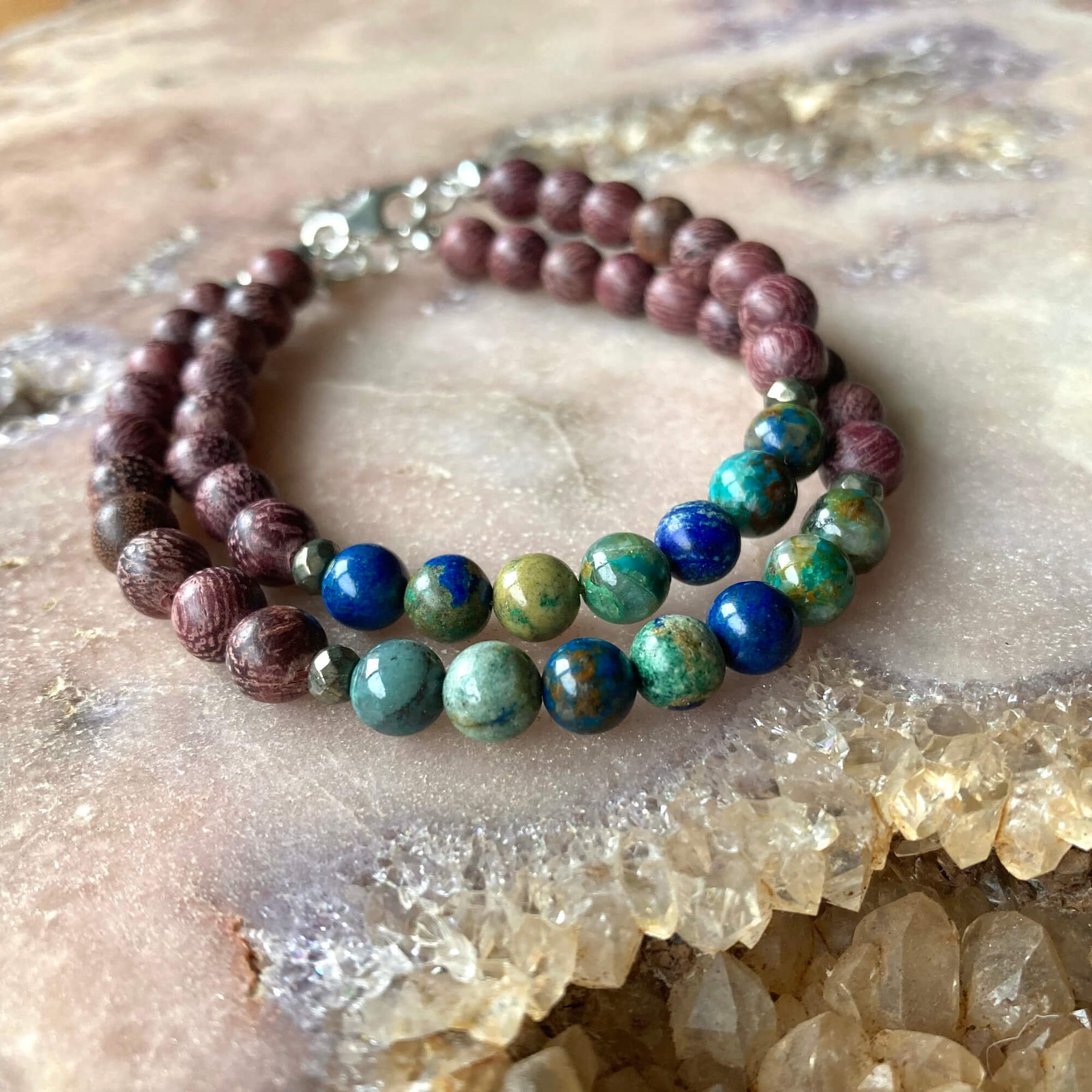 Azurite is especially beneficial if you find it hard to communicate your own needs and desires, it gently balances both Heart and Throat Chakras, allowing clear, truthful communication and heartfelt self-expression to shine through, enabling bonds to be strengthened from a place of truth.