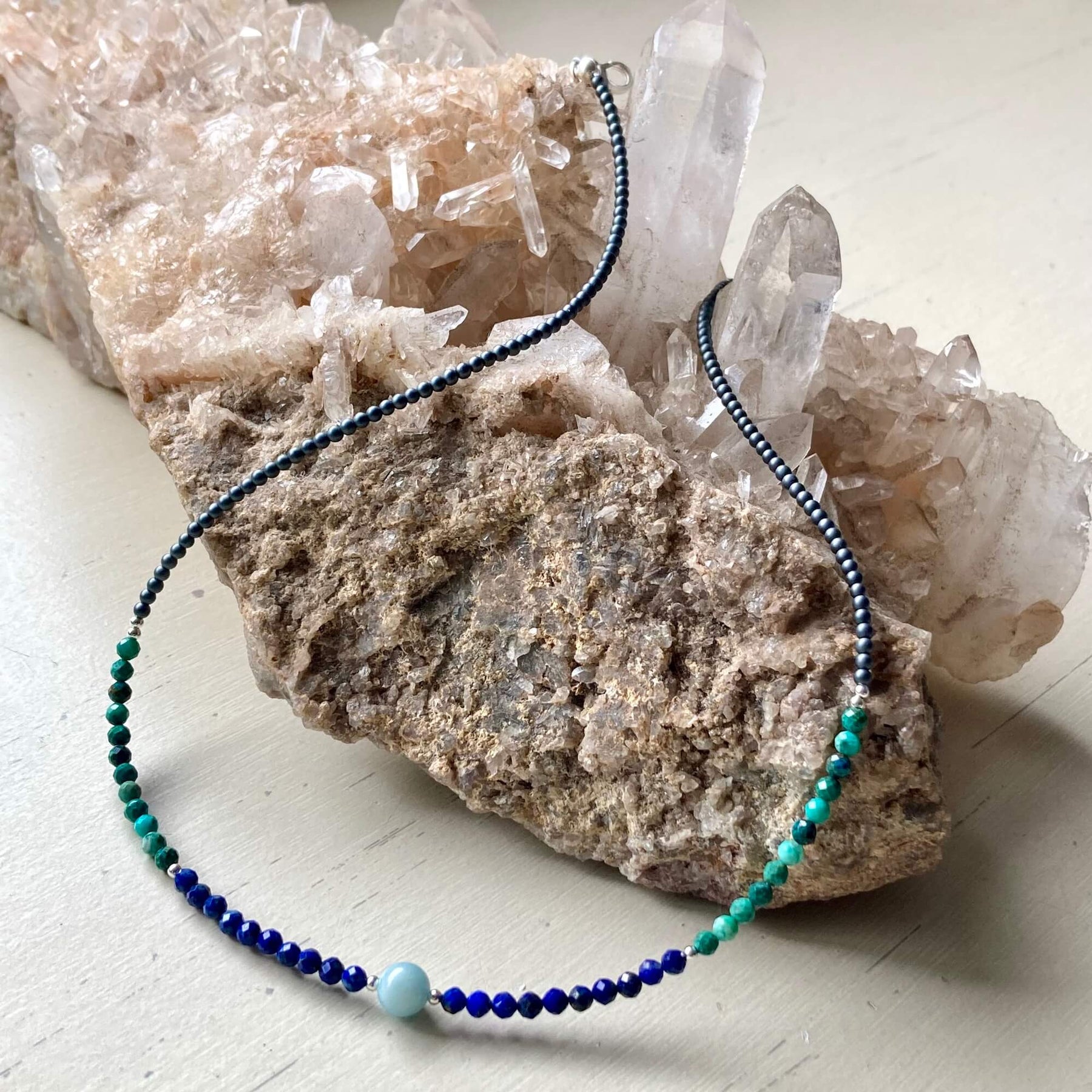 The goddess of truth necklace features Chrysocolla, Aquamarine and Lapis Lazuli, powerful crystals for expression and communication.