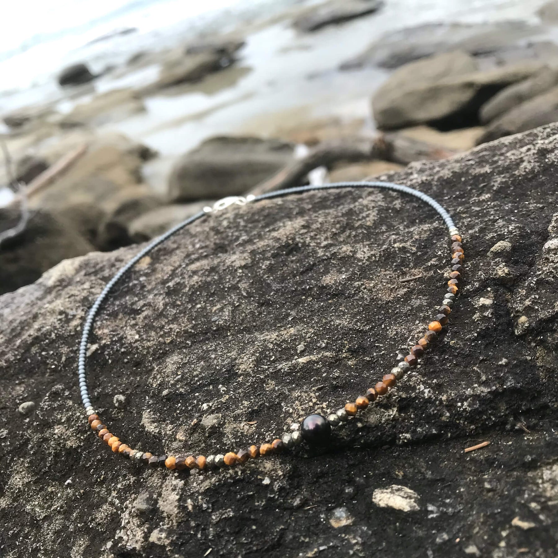 Tiger Eye, Pyrite & Black Pearl Necklace