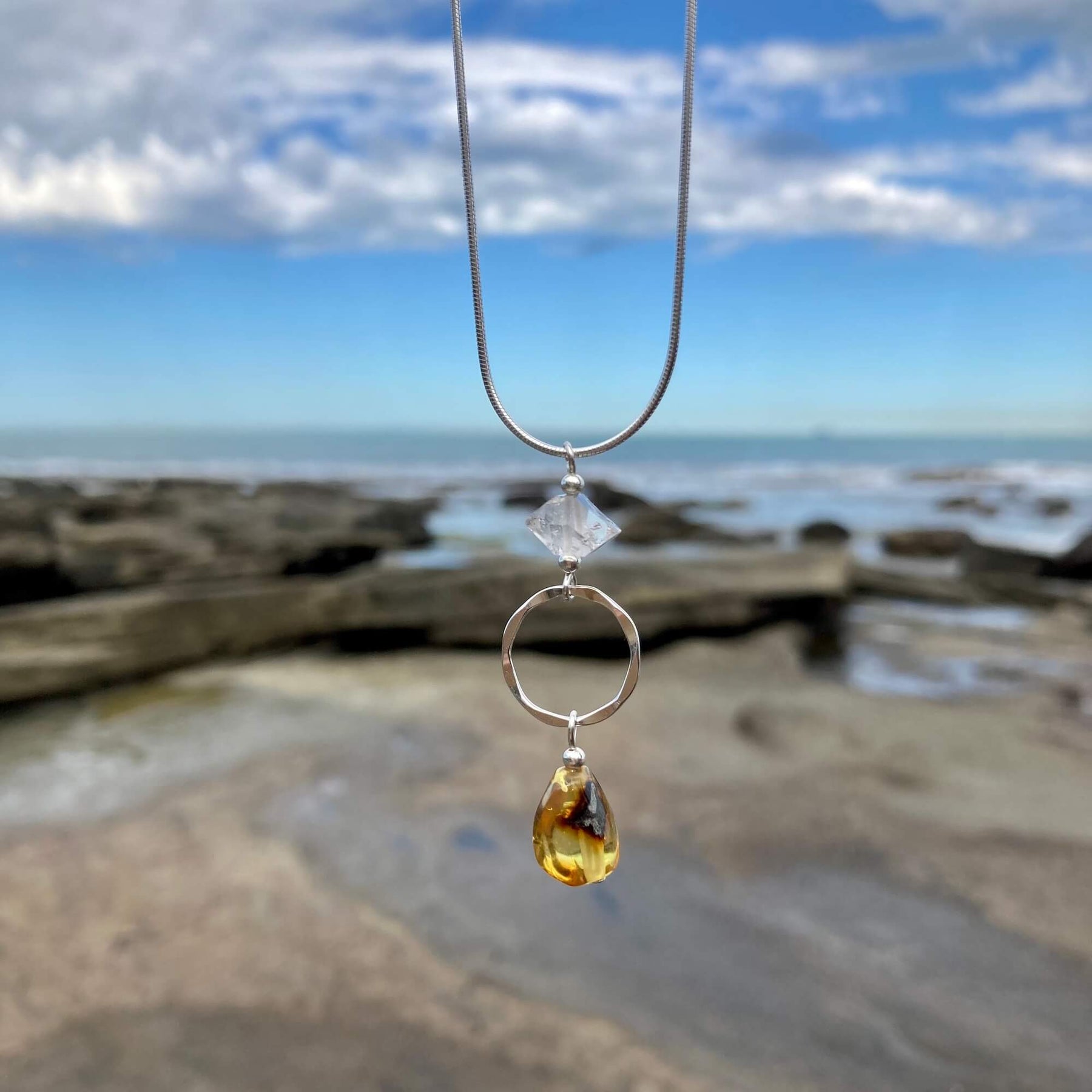 Amber and Herkimer Diamonds combined fill your entire being with both white and golden light, allowing you to raise your personal vibration, honour your own light within whilst protecting and guiding you on your path of authenticity and knowing.