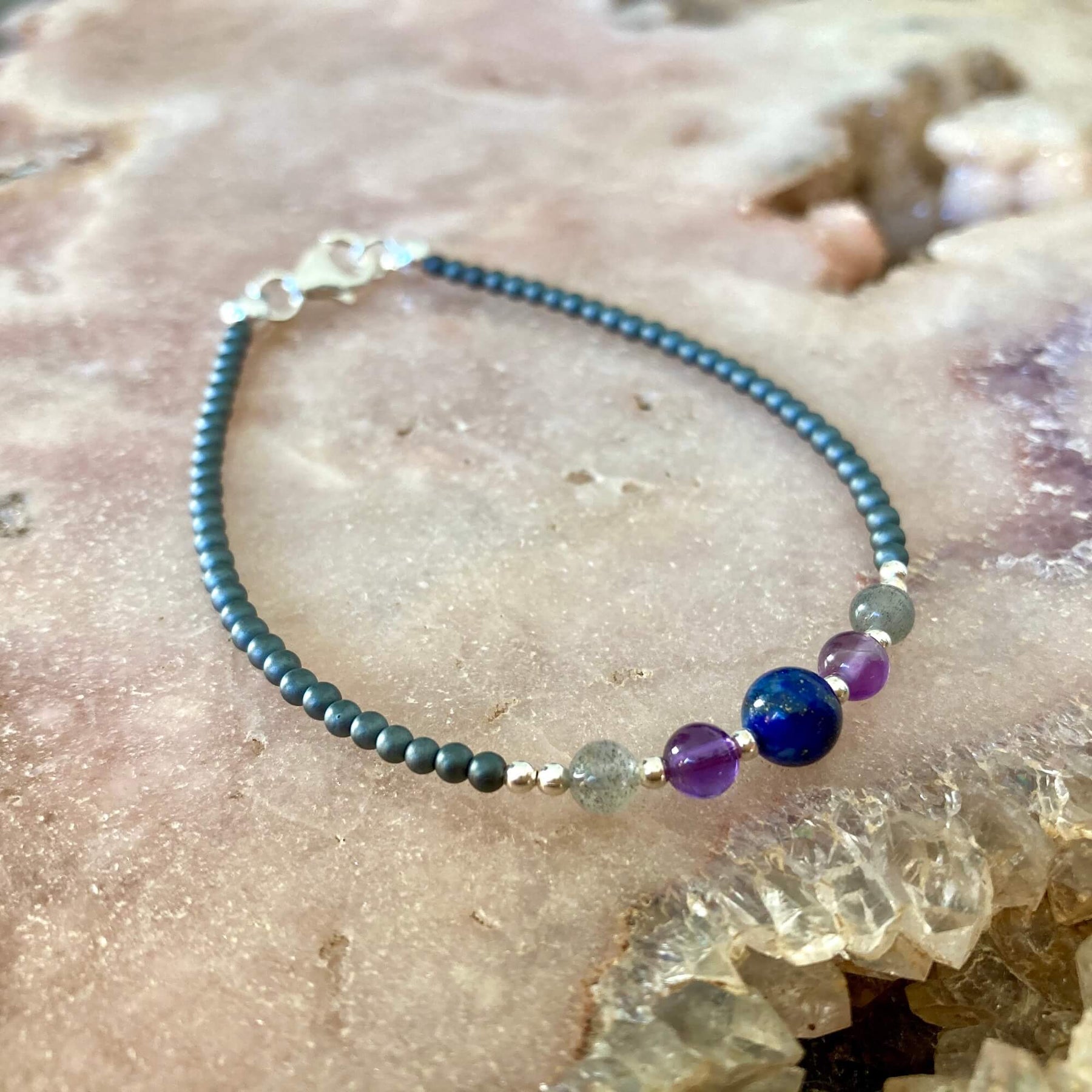 Amethyst, Labradorite and Lapis Lazuli combined encourages your sense of adventure and passion for life, while supporting you to be in the here and now.